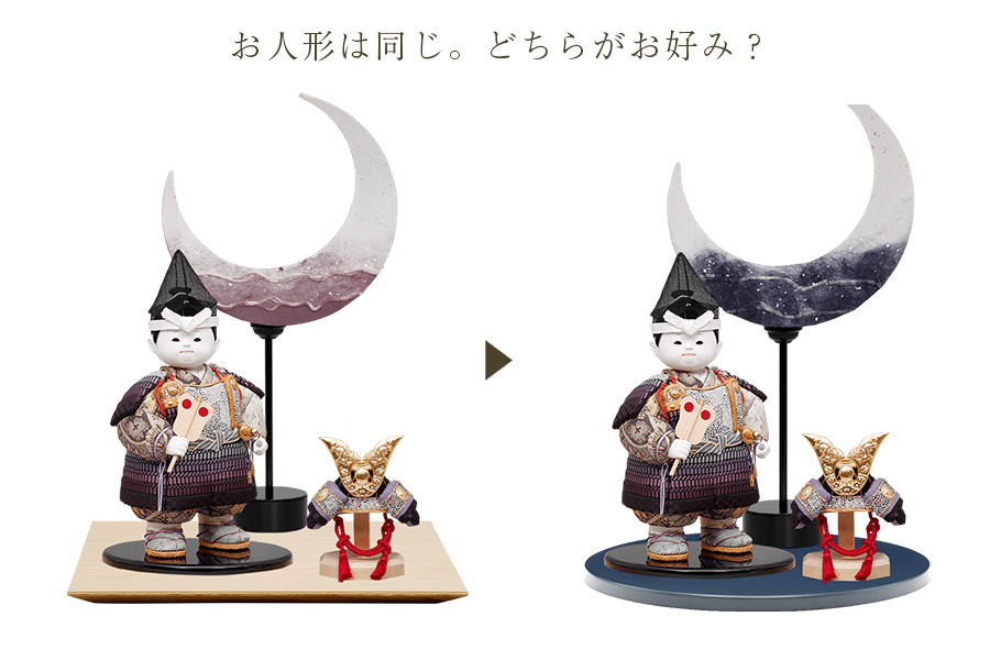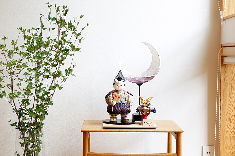 お人形の威と同色の、オブジェをイメージした三日月の和紙飾りと一緒に飾ります。