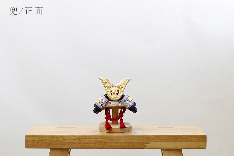 凛々しさの中にあどけなさを感じる木目込み鎧着大将。同じ色の威で合わせた木目込み兜を脇に飾り、より勇ましく。兜の鍬形は純金の箔押しを施してあります。