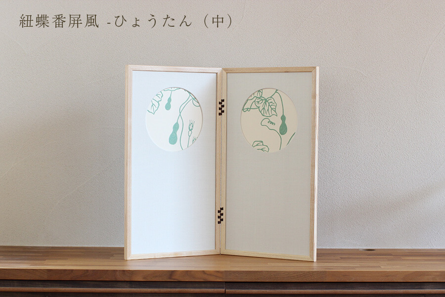 ひょうたん:開運招福、子孫繁栄の象徴と云われるひょうたんを描いた紐蝶番屏風。蝶番に金属ではなく紐蝶番を用いることで、木のあたたかい雰囲気を引き立てます。 - お道具