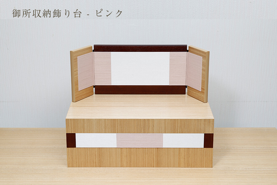 御所収納台 ピンク:ナチュラルな雰囲気がスタイリッシュな飾り台。お人形や屏風など全て飾り台に収納できるため、出し入れも簡単です。