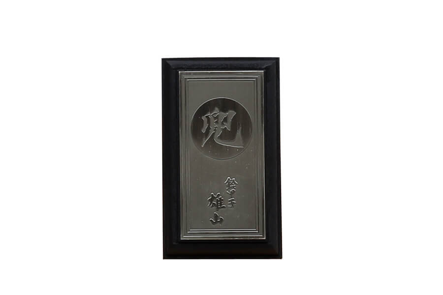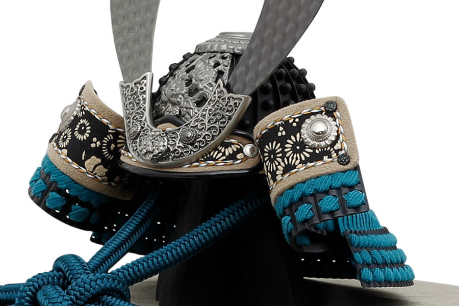 吹き返し、眉庇には、鎌倉時代に流行したと云われる菊籬の絵柄が白い漆で描かれています。金具は全て銀ブロ仕上げで、シックで重厚感のある佇まいが魅力。
