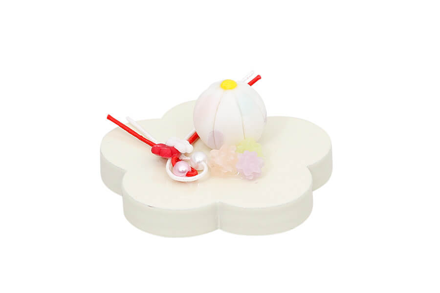 梅の花に可愛らしいお菓子をのせた前飾りです。水引きがお祝いに花を添えます。