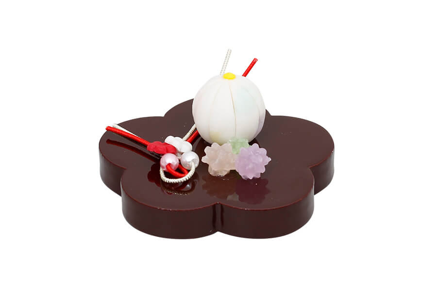 梅の花に可愛らしいお菓子をのせた前飾りです。水引きがお祝いに花を添えます。
