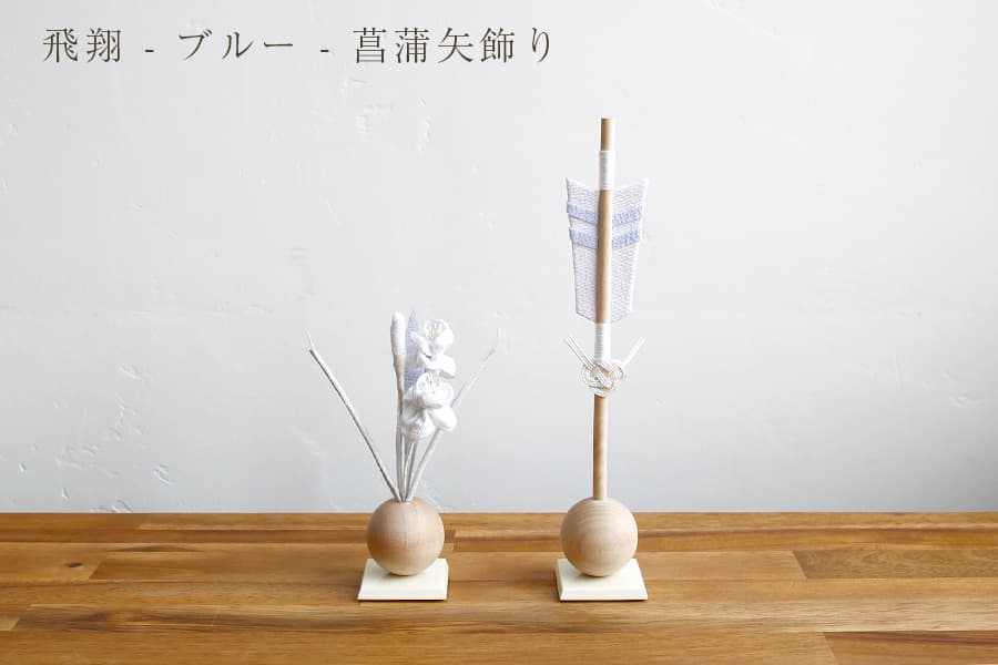 飛翔 - 菖蒲矢飾り:兜に合わせたやさしい色目の弓と菖蒲。菖蒲は『尚武』や『勝負』と通じることから、 男の子が強く逞しく成長するようにとの願いが込められています。 - 桐箱