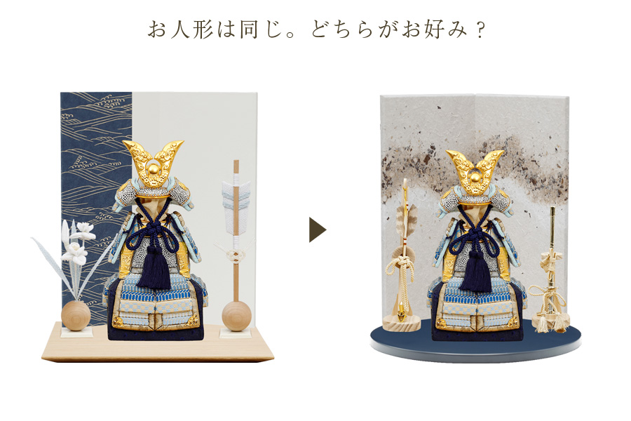 5月の爽やかな空をイメージした水色のグラデーションが美しい木目込み鎧です。鍬形は純金箔押し。V型、三日月、お好みの鍬形をセレクトできます。