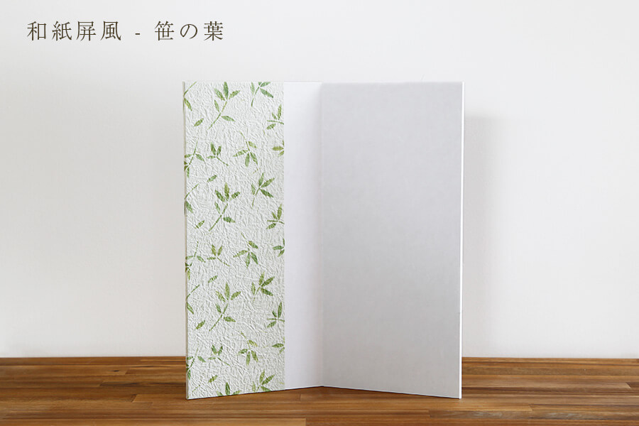 和紙屏風 笹の葉:木の板に和紙を張り合わせ丁寧に仕上げました。白地に笹の爽やかなグリーンでシンプルに。 - 桐箱