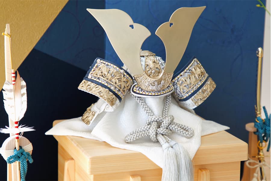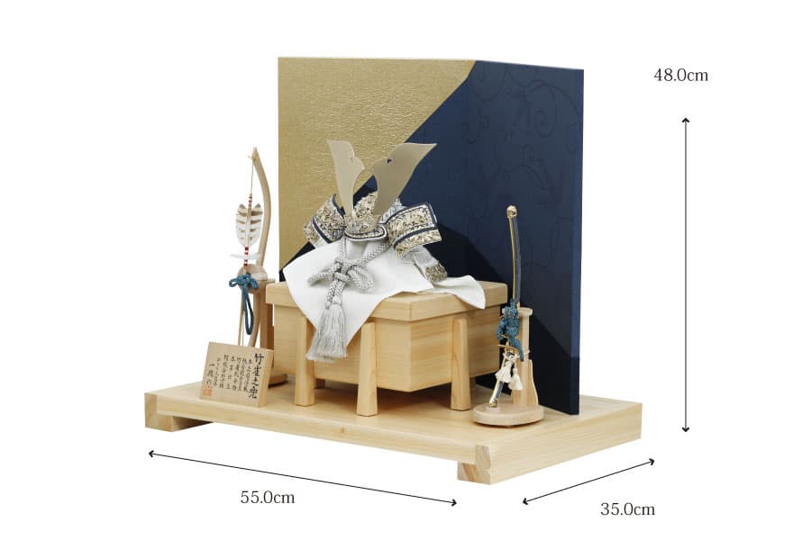 国産木曽檜ならではの淡く美しい木肌と香りが、兜の華やかさを一層引き立てます。
